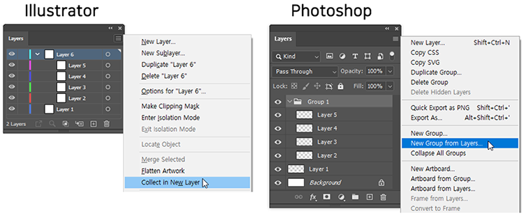 포토샵에서는 레이어들을 그룹으로 만들어서 작업을 효율적으로 정리하면서 진행할 수 있습니다. 일러스트레이터에서는 “Group(그룹)”이라는 명칭을 사용하지 않지만 “Collect in New Layer(새 레이어에 … 더 읽기