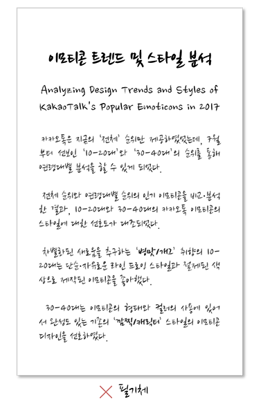 제목이나 소제목, 그리고 짧은 내용의 문구에 적용하는 것은 괜찮지만 긴 본문에 사용하게 되면 가독성이 낮아집니다. 특정한 주제의 디자인을 제외하고는 본문에 사용하면 안 되는 폰트의 종류 중 하나입니다.