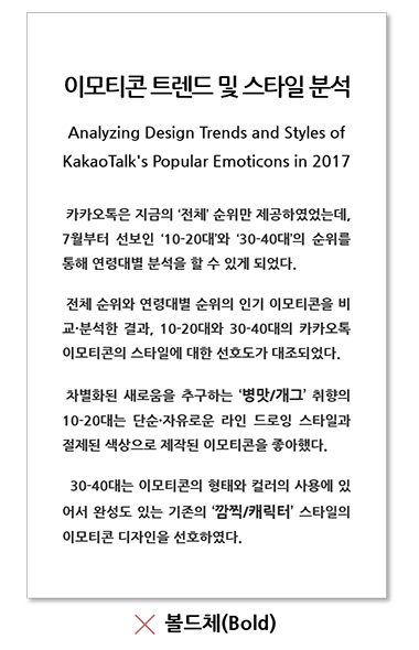 본문에 볼드체를 사용하게 되면 글을 읽는데 가독성이 낮아지는 것도 문제이지만, 전체적인 디자인 구성에서 중요한 역할을 담당하는 디자인 요소들의 속성이 사라져 전체적인 디자인 가독성도 떨어집니다.