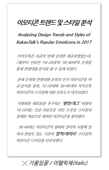 폰트의 종류보다는 소프트웨어에서 폰트의 속성으로 제공하는 스타일입니다. 한글의 경우, 운동감을 표현하는 특별한 디자인 콘셉트를 제외하고는 사용하지 않는 것이 가장 좋습니다!