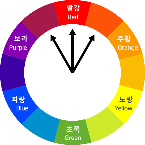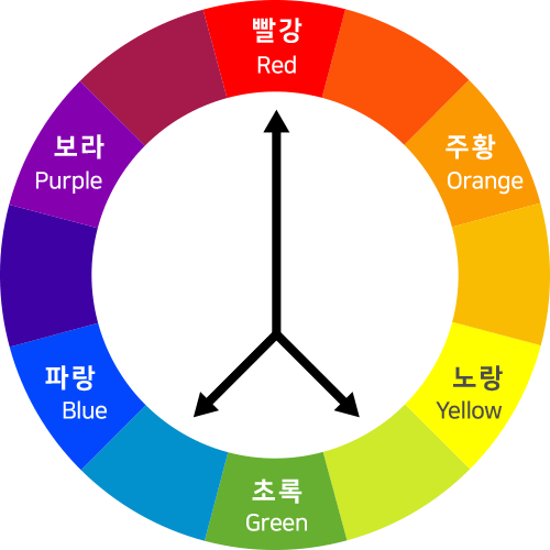 분할 보색(Split Complementary)은 색상환에서 선택한 컬러의 맞은편 해당 보색의 양옆에 위치한 두 색을 선택하여 총 세 개의 컬러로 구성하는 배색 방식입니다.