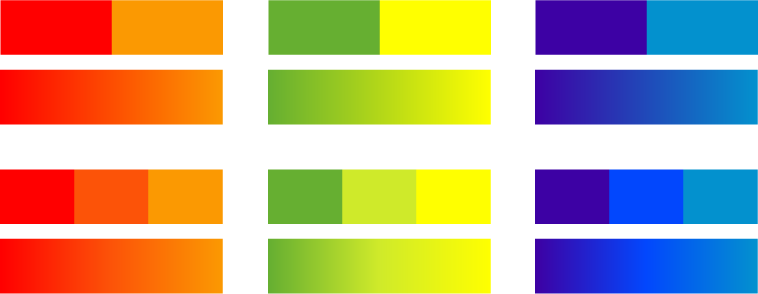 유사색을 응용하면 안전하고 조화로운 배색으로 그라데이션(Gradient)을 효과적으로 적용할 수 있습니다. 색상을 2개보다는 3개를 이용하면 더욱 깊고 부드러운 그라데이션을 디자인 할 수 있습니다.