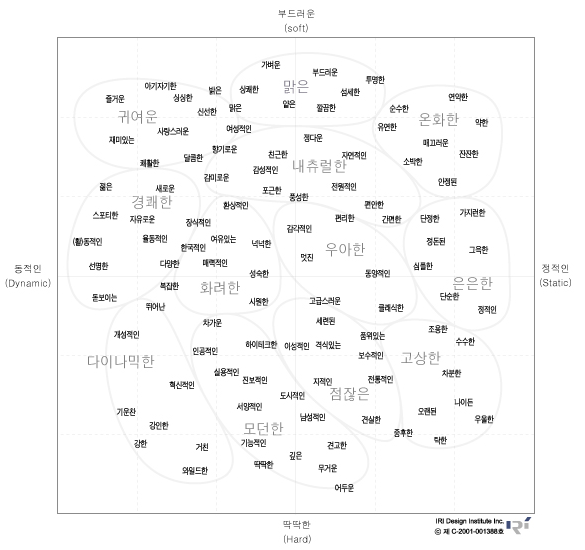 X축은 ‘동적인(Dynamic)’과 ‘정적인(Static)’, Y축은 ‘부드러운(Soft)’과 ‘딱딱한(Hard)’을 요인으로 구성되어 있어서 주제에 맞는 형용사가 없어도 해당하는 주제의 감성이 위치할 부분을 정하여 관련된 색과 배색을 유추할 수 있다.
