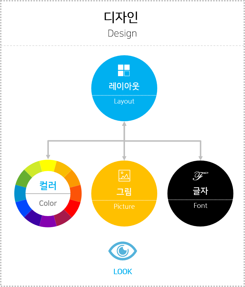 이런 관점에서 보면 디자인은 구성 요소인 컬러, 그림, 글자를 레이아웃 구성으로 시각화한 것이라고 할 수 있겠습니다.