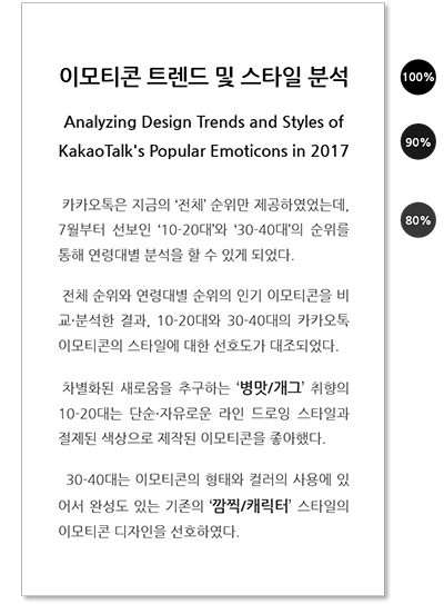 위의 경우 제목에는 검은색 100%, 소제목에는 검은색 어둡기를 90%, 본문에는 80% 정도만 적용한 예입니다.