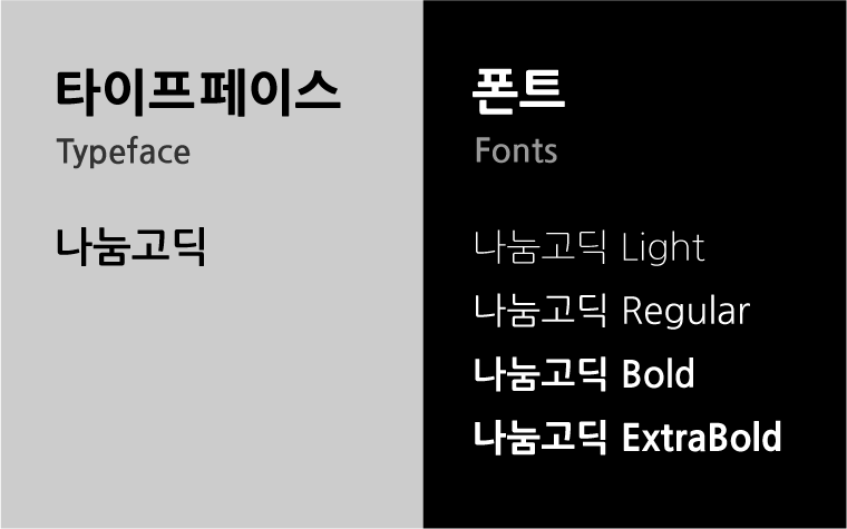 하지만 이는 반은 맞고, 반은 틀린 것으로 좀 더 정확히 얘기하자면 “나눔고딕 타이프페이스(Typeface)를 사용했습니다!”라고 말하는 것이 정확합니다.