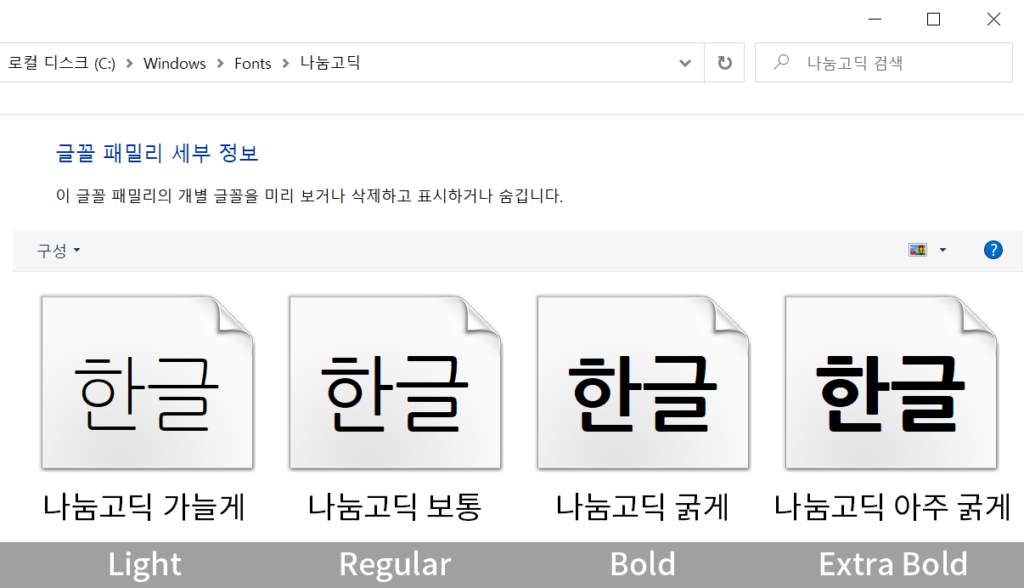 윈도우 시스템에서 폰트 중 나눔고딕을 찾아보면 위의 그림과 같이 ‘나눔고딕 가늘게(Light)’, ‘나눔고딕 보통(Regular)’, ‘나눔고딕 굵게(Bold)’, ‘나눔고딕 아주 굵게(ExtraBold)’가 한 세트로 구성되어 있습니다.
