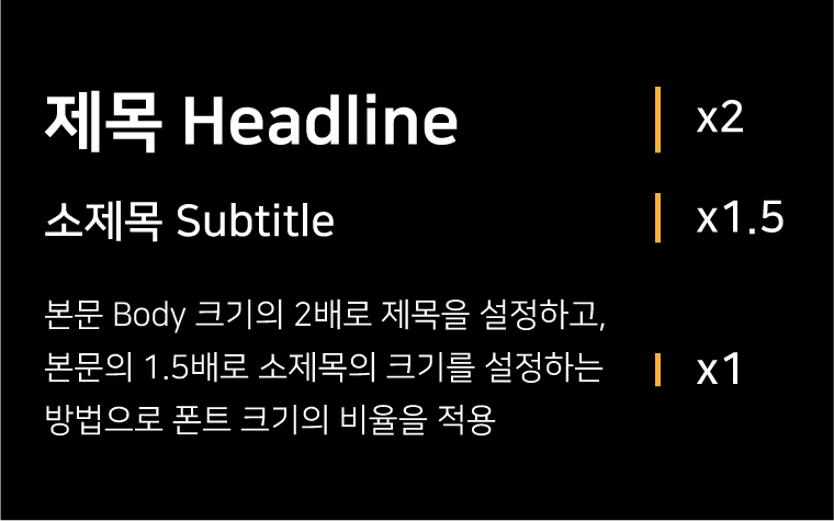 디자인 방법 중 일반적으로 제목, 소제목, 본문에 적용하는 크기의 비율이 있습니다. 본문이 10pt면 제목은 2배인 20pt로 설정하고, 소제목은 제목과 본문의 중간인 15pt를 적용합니다.