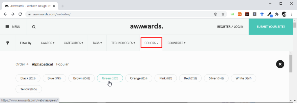 헥스 코드(Hex Code)로 검색할 수 있는 기능 제공으로 좀 더 정확하게 원하는 자료 서치 가능 - 어워즈(awwwards.)