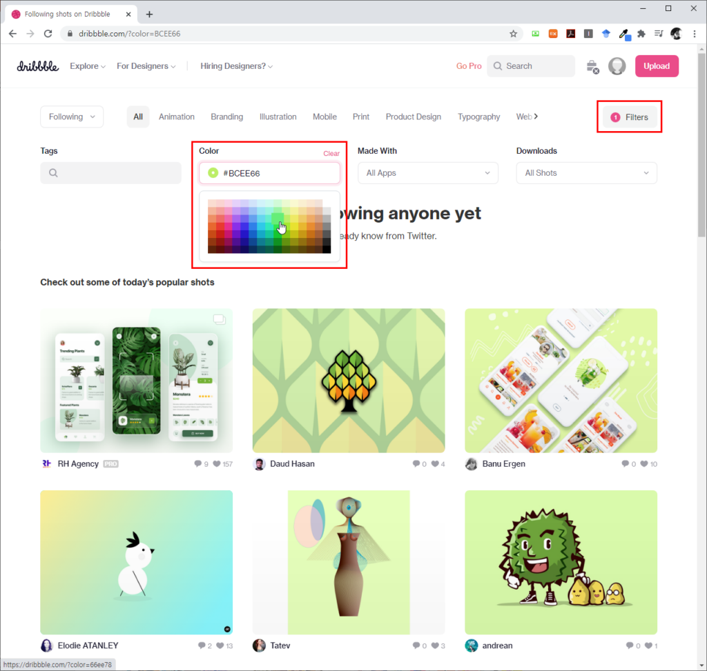 드리블(dribbble)은 글로벌 디자이너 커뮤니티로서 다양한 디자인 분야의 전문적인 작품을 검색할 수 있는 곳입니다. 컬러 팔레트를 제공하고, 색상의 헥스 코드(Hex Code)를 알고 있으면 해당 컬러의 디자인 자료를 보다 정확하게 알아볼 수 있습니다.