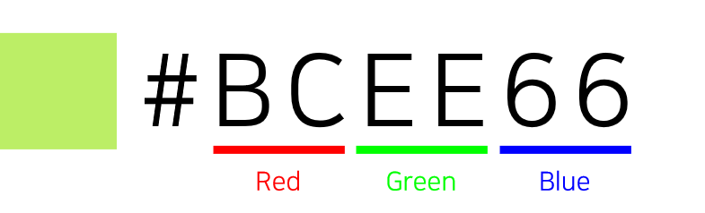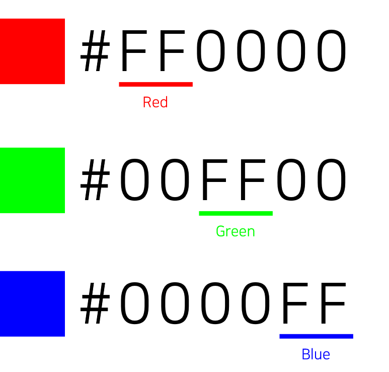 그래서 “#FF0000″은 Red 값이 가장 높고 나머지 컬러는 낮기 때문에 빨간색(Red)을 표현하고, 같은 원리로 “#00FF00″은 녹색(Green), “#0000FF”는 파란색(Blue)을 나타냅니다.