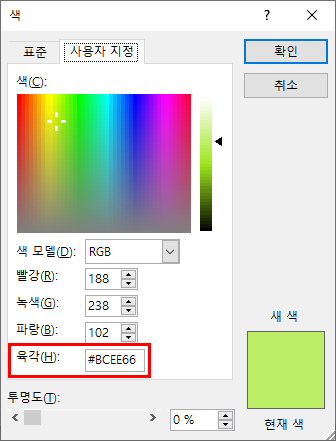 파워포인트와 같은 소프트웨어에서도 헥스 코드를 입력/분석할 수 있습니다. “도형 채우기” 등과 같은 색에 관련된 기능에서 “다른 채우기 색” 등을 통해 헥스 코드값을 알아낼 수 있습니다.