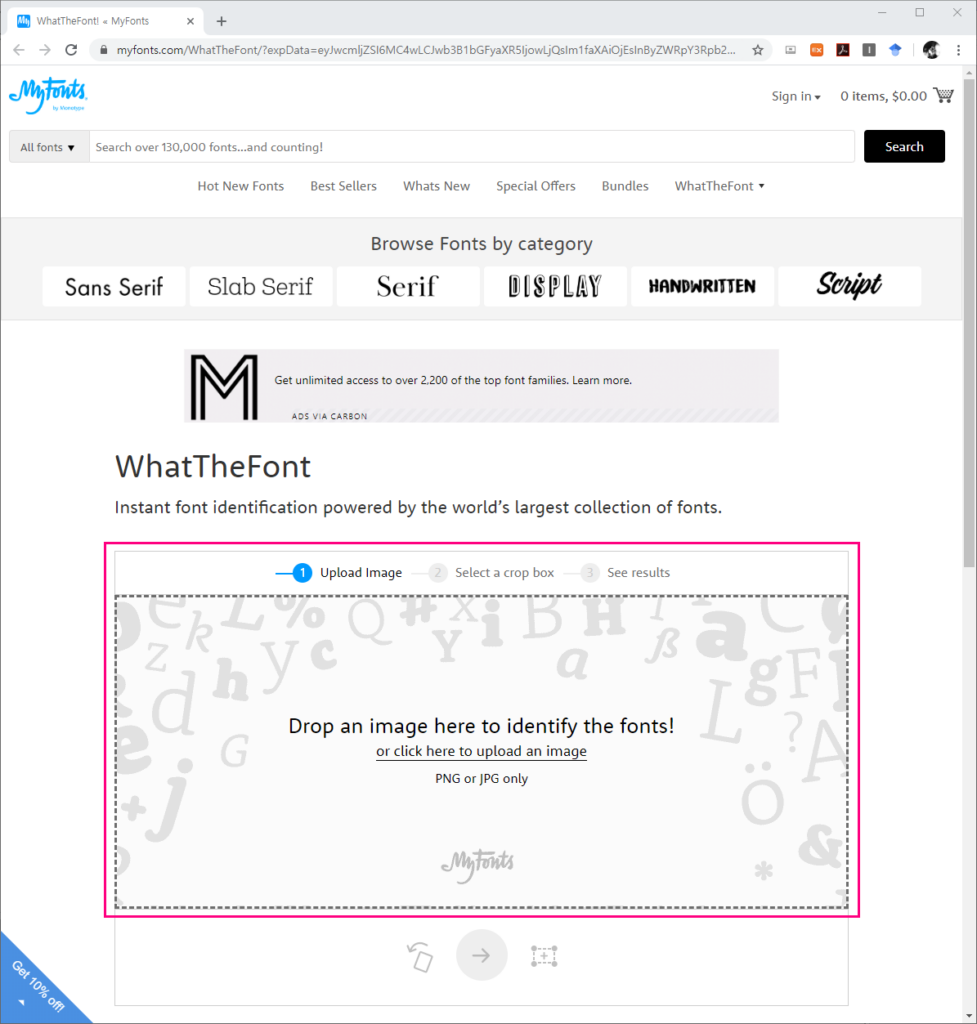 WhatTheFont의 네모 박스 안에 이미지 파일을 드롭하거나 업로드하면 됩니다.