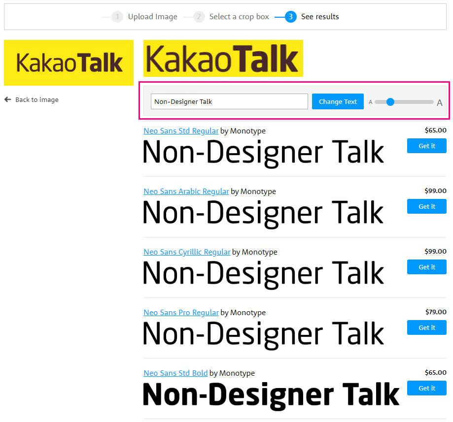 검색 과정을 거친 후, 해당 이미지와 관련된 폰트들을 보여줍니다. 오른쪽에 가격도 표시됩니다.