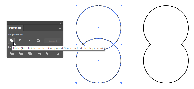 패스파인더 패널의 Shape Modes(모형 모드) > Unite(합치기) 기능을 구현합니다.