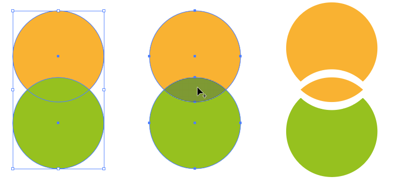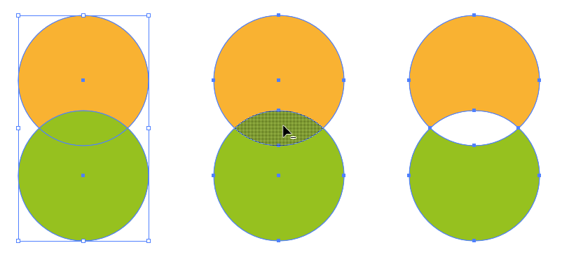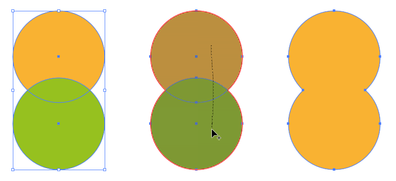 겹쳐진 오브젝트들을 합치고 나누는 데는 이 Shape Builder Tool을 사용하면 쉽고 직관적으로 아래와 같이 패스파인더 패널의 기능을 구현할 수 있습니다.