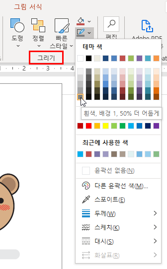 ❶ 홈 > 그리기 > 도형 윤곽선 선택 후, 테마 색을 선택합니다.