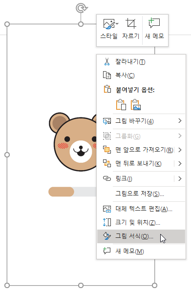 ❸ 해당 그림을 선택 후, 오른쪽 마우스 버튼을 클릭하여 그림 서식(Format)을 선택합니다.