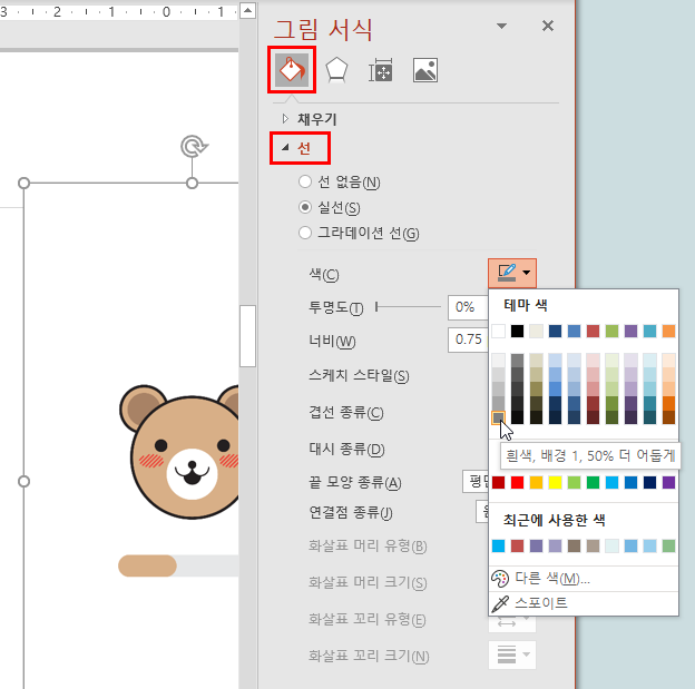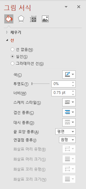 ※ 오른쪽에 [그림 서식] 대화 상자를 활성화한 후, 선 옵션들을 조정하는 것이 편리합니다.