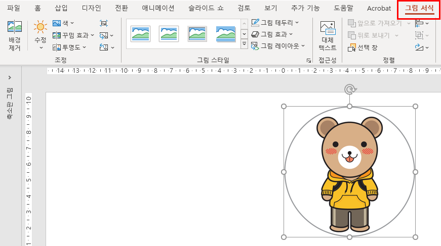 1) 그림을 선택 후, 메뉴 중 그림 서식(Format)을 선택합니다. 또는 그림을 더블 클릭하여 선택하면 그림 서식으로 활성화됩니다.