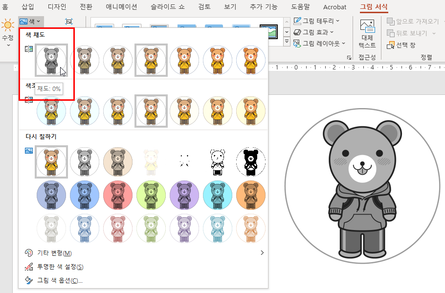 2) 그림 서식(Format) > 조정(Adjust) > 색(Color)에서 옵션을 선택해서 변환하면 됩니다.