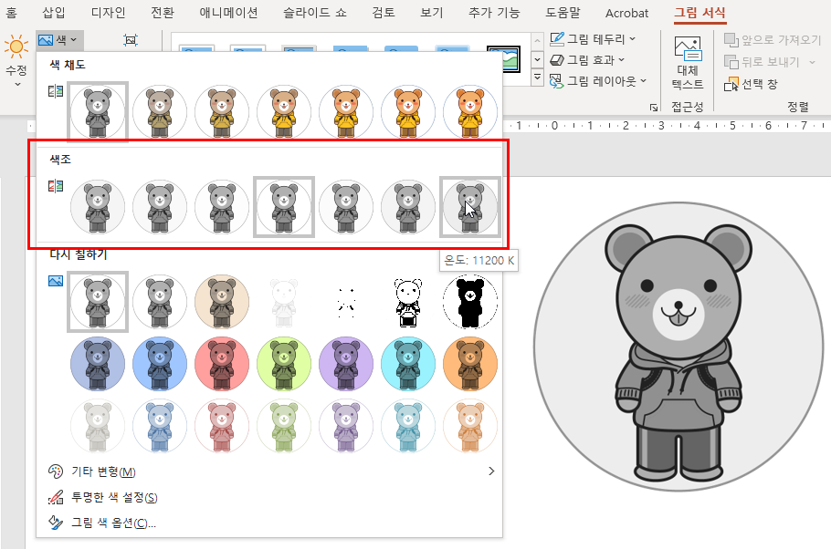 컬러 사진도 마찬가지로 적용하면 파워포인트에서 흑백 사진으로 변환할 수 있습니다.