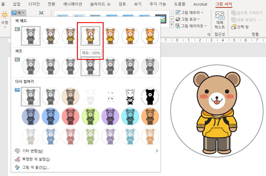 색 > 색 채도에서 채도: 100%(중간)를 선택하면 원래의 색으로 돌아옵니다.